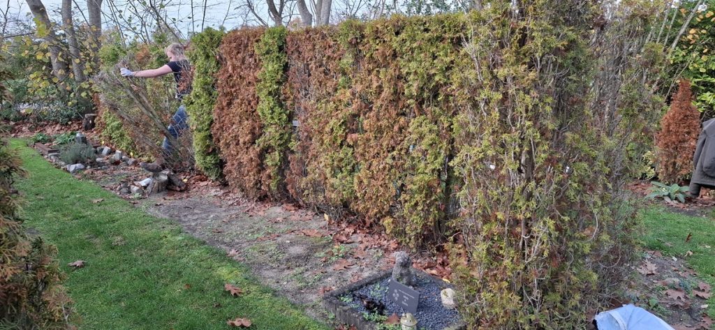 Een deel van de hoge heggen is inmiddels ‘schoon geblazen’ en netjes gesnoeid, stukje bij beetje werk ik de rest de komende maanden verder bij.