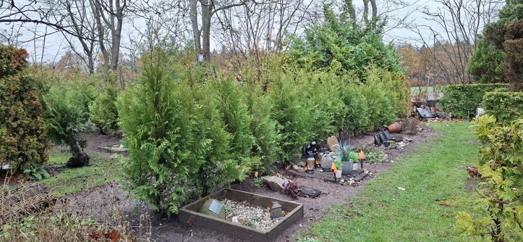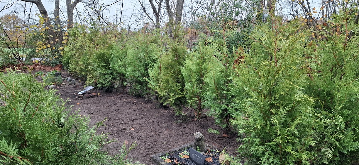 De afgelopen weken zijn we druk bezig geweest op de Larixhof met het vervangen van twee volledige rijen coniferen. Een flinke klus — zeker nu de grond zo nat is — want het gebruik van een kraan zou meer schade dan goed doen. Daarom was het allemaal puur handwerk: met de schop de oude coniferen voorzichtig verwijderen, geheel ‘nieuwe’ grond erin daarna de nieuwe coniferen terugzetten.