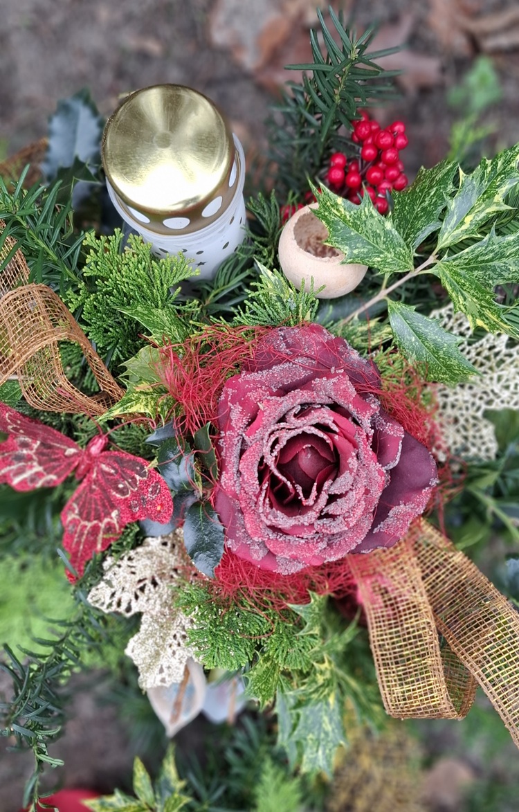 De kerst grafstukken zijn verkrijgbaar in wit of rood/goud, en worden gemaakt met groen afkomstig van de Larixhof en thuis. Dit jaar hebben we ook prachtige takken mogen ontvangen van Annelies – dankjewel!